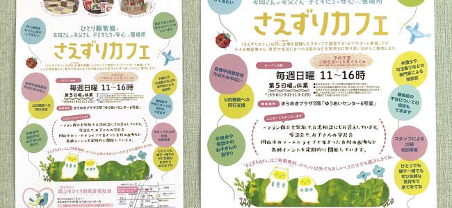 今年も作らせてもらっています 一般社団法人岡山市ひとり親家庭福祉会さんが設置されている相談窓口 さえずりカフェ オープン案内チラシ・ポスター…
